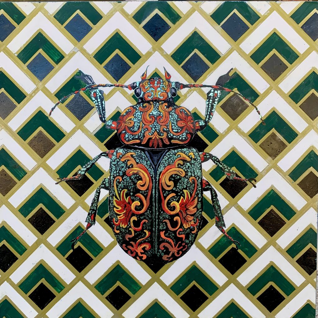 Marco Araldi, based in London, produces opulent and richly detailed works, combining gold and lush colours, depicting architectural and natural images.