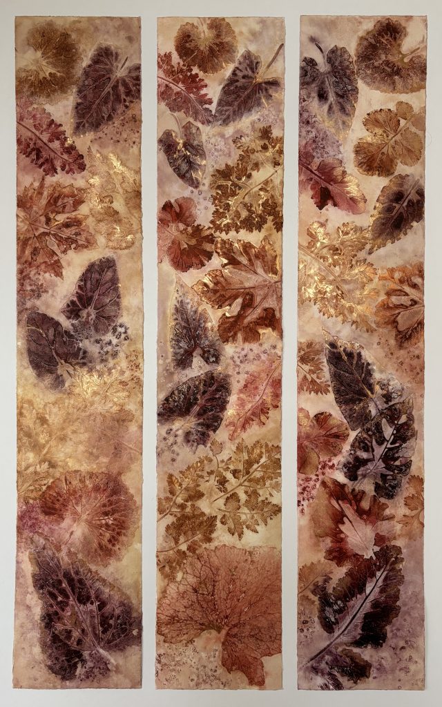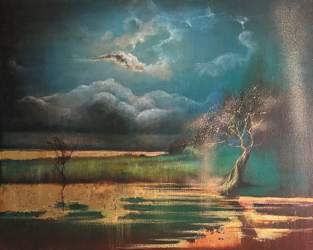 Hiroko has continued to develop her unique and instantly recognisable style, blending oil, metal leaf, and patination on canvas and panel, expressing the spirit of nature and especially local trees.